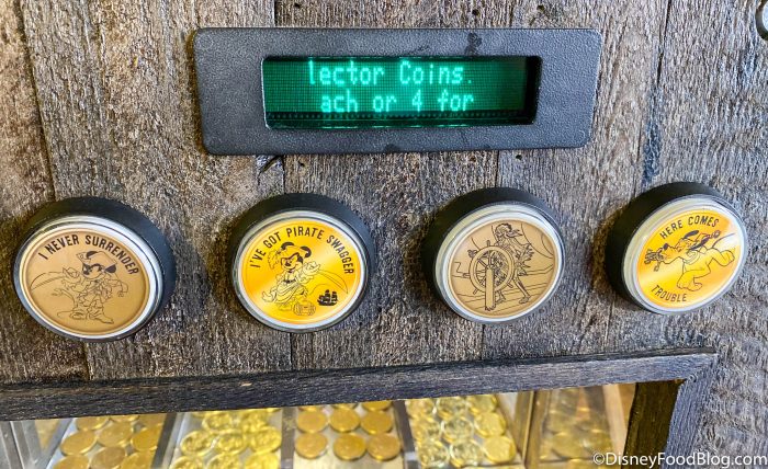 This machine had all gold coins featuring 4 different pirate designs. There was a Mickey coin that says “I Never Surrender,” a Minnie design that says “I’ve Got Pirate Swagger,” a medallion featuring that signature scene of a skeleton pirate at the helm of a ship, and a medallion with Pluto holding the keys (like the dog in the ride) with the phrase “Here Comes Trouble” on it.