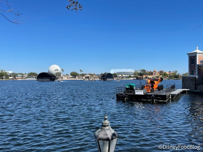 It’s without question that EPCOT’s upcoming nighttime spectacular, Harmonious, is one of our most anticipated attractions in Disney World, which is why we get SUPER psyched any time we see new construction afloat. And continuing this pattern of eager fandom, we spotted another construction barge on World Showcase Lagoon today!