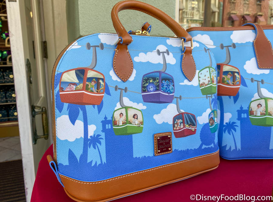 After we’ve already seen one Skyliner bag collection, we were thrilled to find yet another in the parks! This series, though, is very different from the last with more gondolas coasting through the sky with the silhouettes of park attractions and icons in the background. And, it finally has made its official debut in Disney World today!