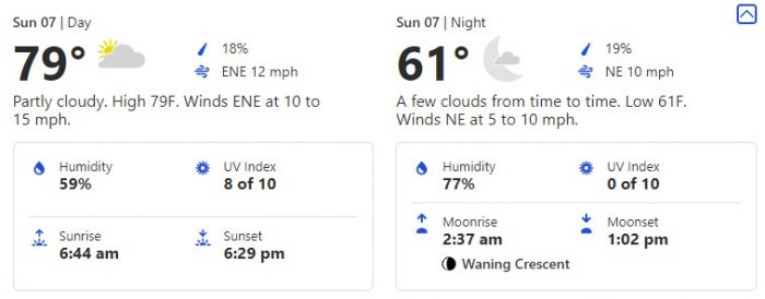 For Thursday, March 4th, we’re seeing a slightly cooler day (see a pattern?) in the mid-80s and a similar drop in the evening to the low 60s.