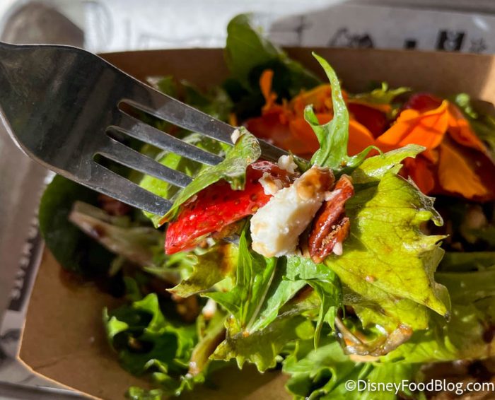Where is our salad journey taking us to next? The Polite Pig at Disney Springs! We ordered the Florida Strawberry Salad. The salad is made with organic field greens, strawberries, feta, granola, sorghum dressing, and garnished with edible magnolia petals. You can order this decadent salad as a side for $6 or full for $13. We played it safe and got the side portion to make sure we weren’t overdoing it with the whole “health food” thing.