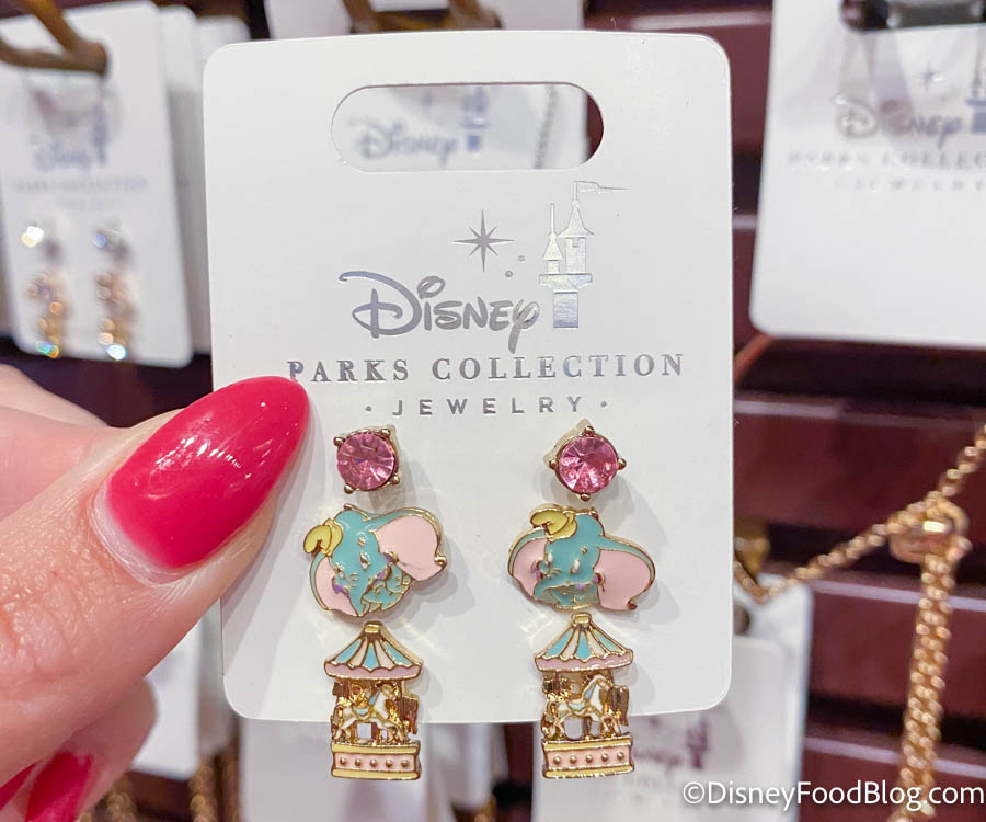 We found something for all you Disney Parks jewelry lovers! We found some new-to-us Dumbo Earrings for $14.99. The pack comes with three different earring sets, one with pink gems, another with Dumbo, and the last with a little carousel from the circus!