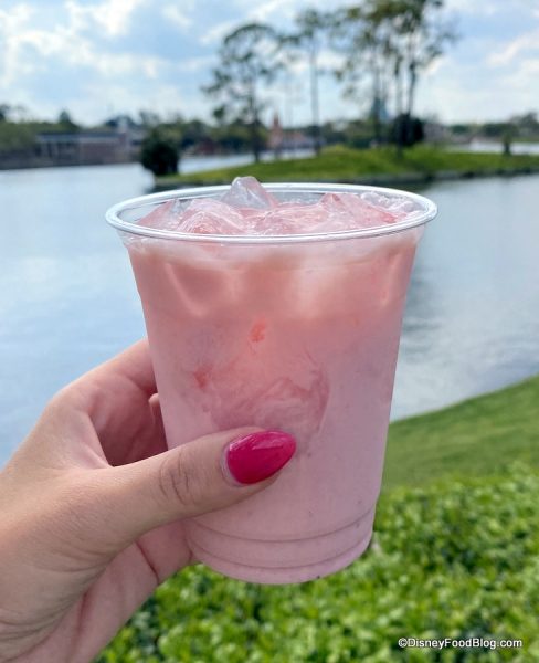 We noticed the sign for something simply called the “Drink Special” listing a combo unlike any we’ve had here — or just about anywhere in the park — before. It’s peach liquor with fresh strawberry milk. (Nope. No tea. 😉 )