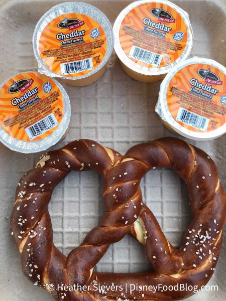 The Mini Meatball Sub is available for $8. Another classic California Adventure food item available at Sonoma Terrace is their Bavarian Pretzel — be sure to add that cup of cheese for an extra dollar (or do what we did and add FOUR cups of cheese for $4)!
