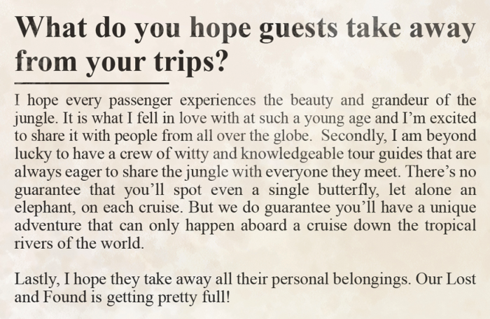 In the interview, Alberta also shares that she hopes guests take away a sense of the beauty and grandeur of the jungle during their expeditions. But, she also hopes they take away their personal belongings!! Seems like that Lost and Found is getting a bit packed.