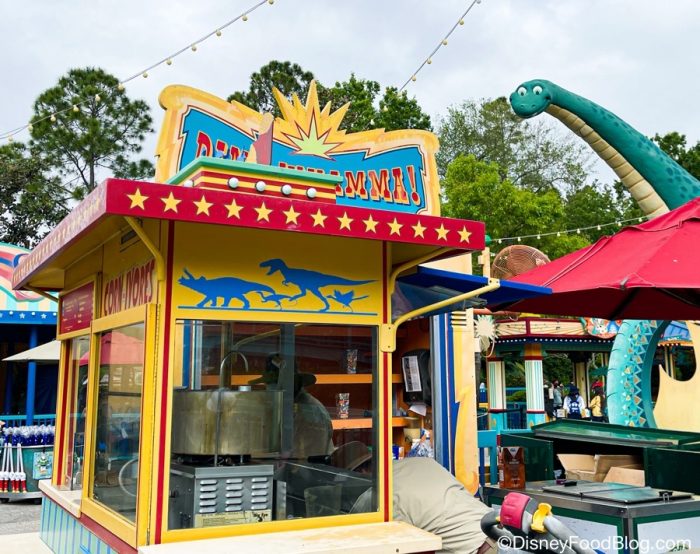 Today, while wandering through DinoLand U.S.A. in Animal Kingdom, we stumbled across a special moment: a dinosaur gazing at a popcorn cart with love in its eyes!