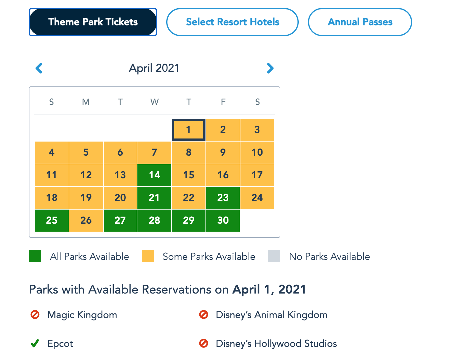 The same is true for the first half of April, with more options opening up later. In fact, the availability calendars for theme park ticket holders and Resort guests are nearly identical!