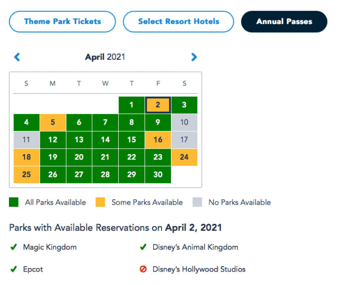 On April 1st and April 3rd, Park Passes are available at all of the theme parks for Annual Passholders! On April 2nd, however, Park Passes are available for all parks except Hollywood Studios for Passholders.