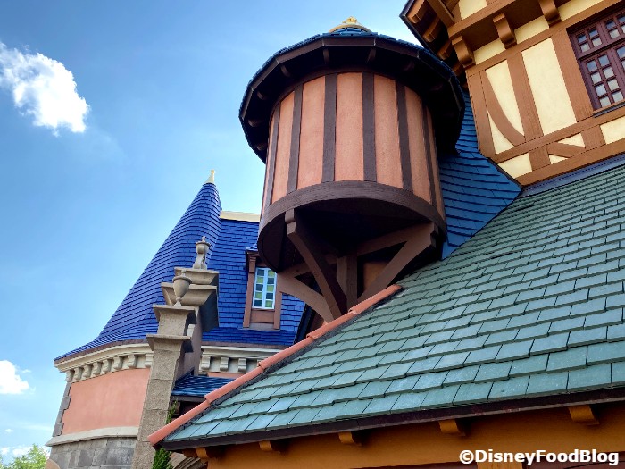 Of course, Walt Disney World needs to be in tip-top shape for such a big anniversary! And we’ve noticed that the rooftops in Fantasyland are being painted to coordinate with Cinderella Castle! See how the roofs are the same shade of rich blue as the castle?!