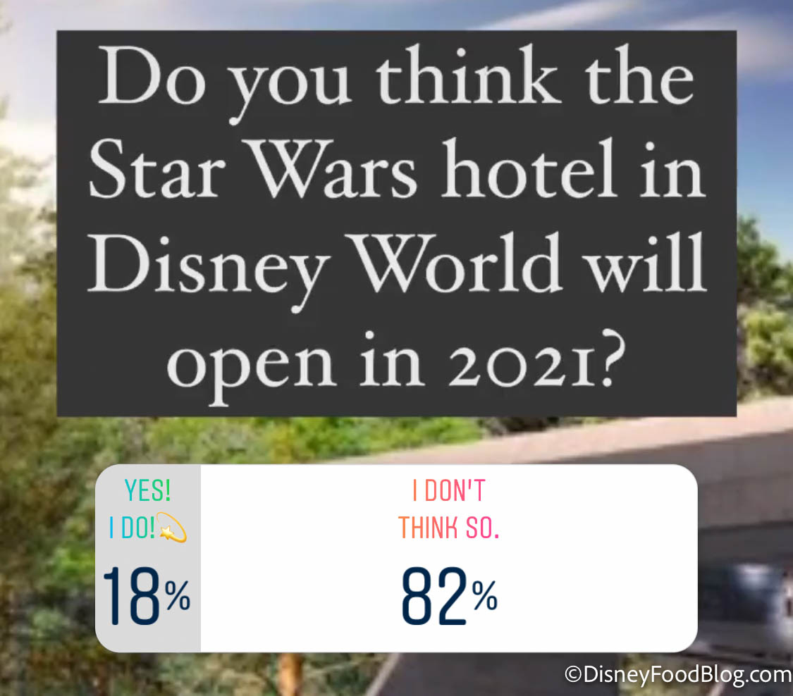 The first question we asked our Instagram followers was “Do you think the Star Wars hotel in Disney World will open in 2021?“ We put up a basic yes/no poll, and the results were pretty surprising!