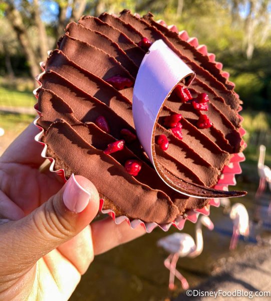 The cake was really rich, in a good, filling way. It was also a really great portion for its $4.79 price tag. The crunchy bits on top of the cake were tart and added a fun pop of color! And the chocolate swirl was a nice, tiny nod to the flamingos nearby.
