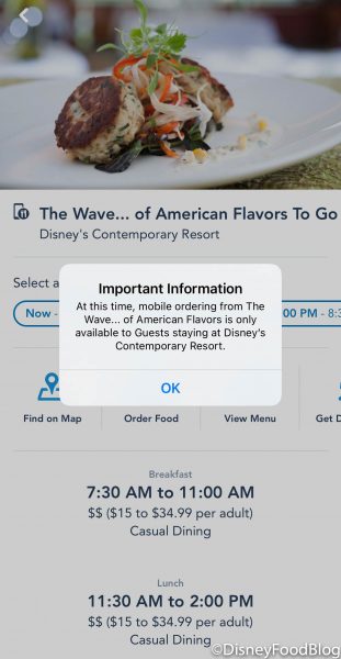 When we were on the Mobile Order section of our My Disney Experience app, we received a pop-up notification that let us know that The Wave… of American Flavors at Disney’s Contemporary Resort would only allow mobile ordering for guests of the hotel. There weren’t any details mentioned in the app about this update.