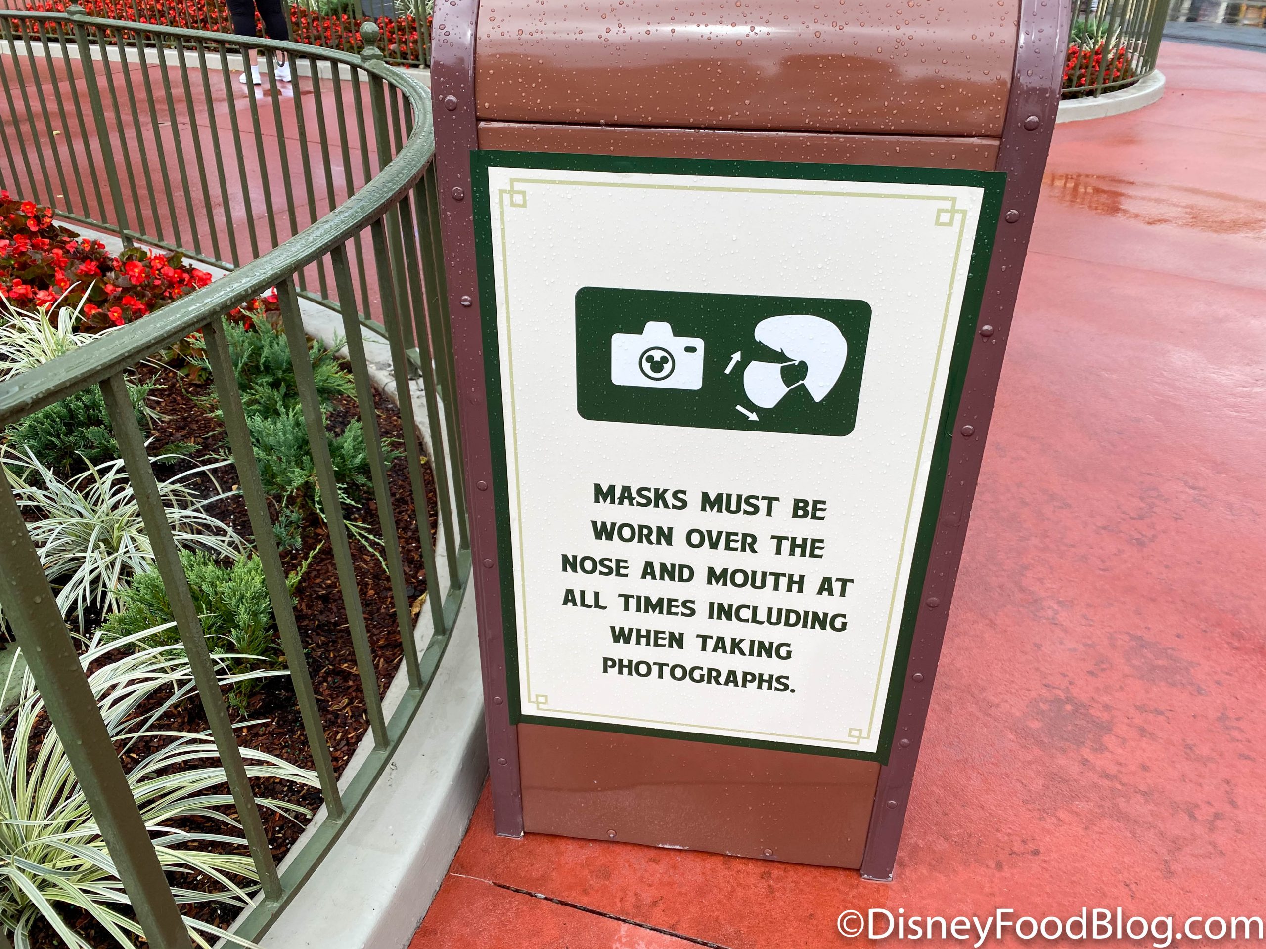 Update: Previously, some trash cans around Disney World contained a sign on them reminding guests that masks had to be worn even when taking photos. You can see a picture of that sign below.