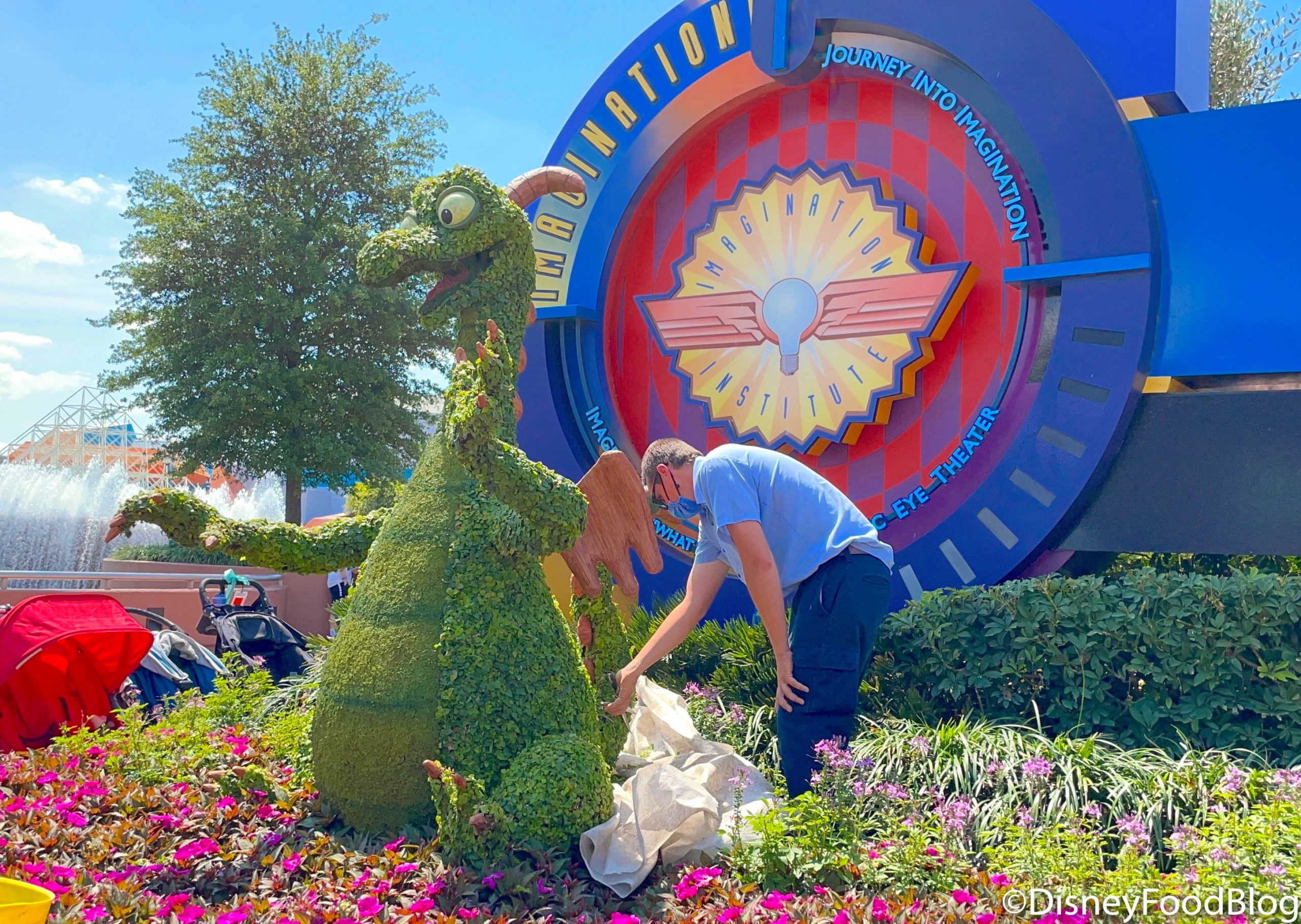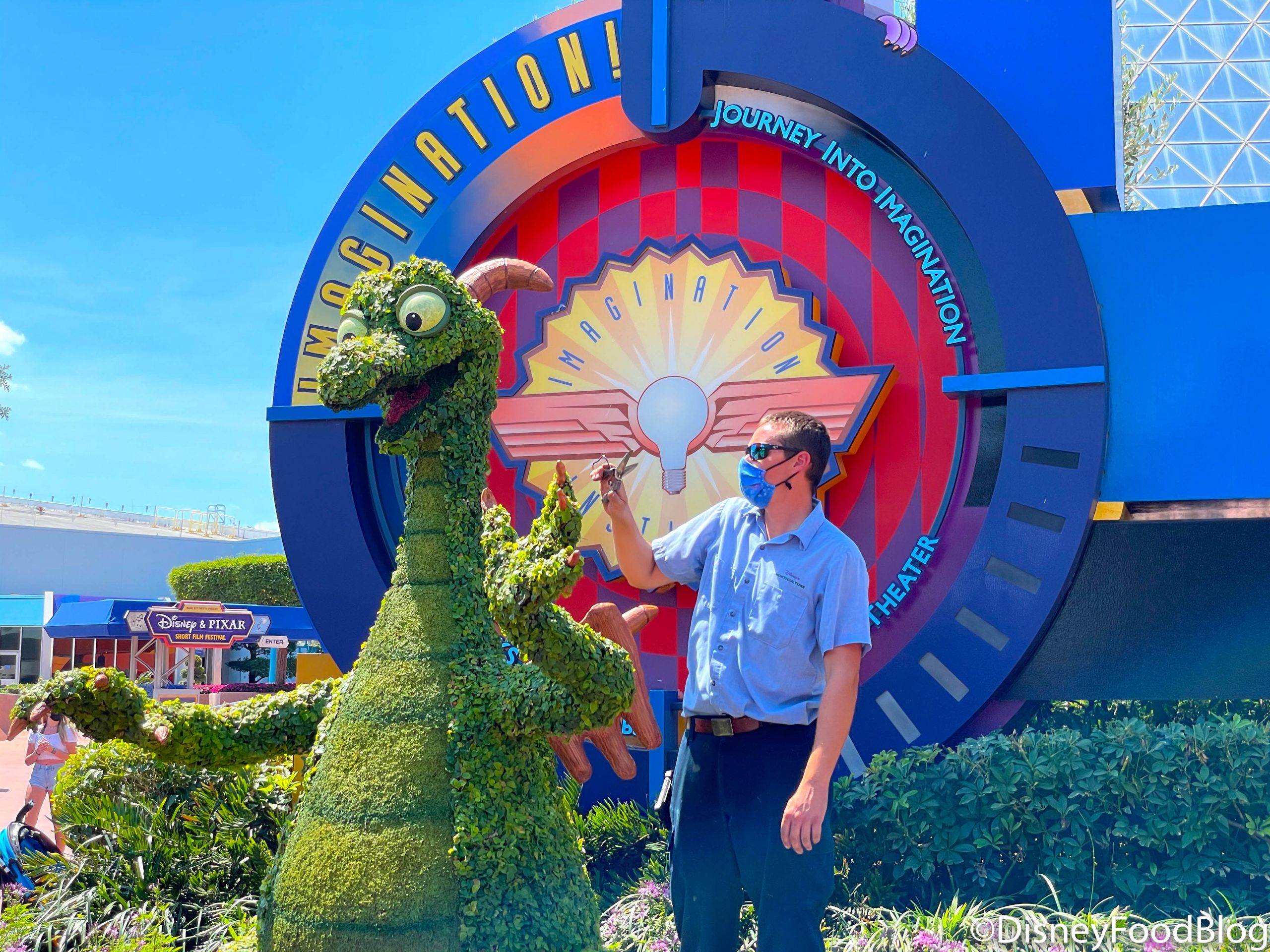 That wasn’t the only spot getting some well-needed TLC in EPCOT, though! The Figment Topiary near Journey into Imagination made a new friend as a Cast Member cleaned up the edges.