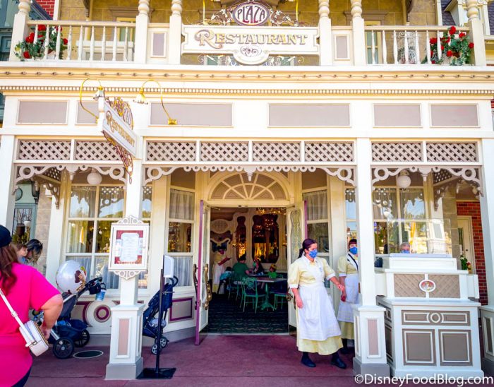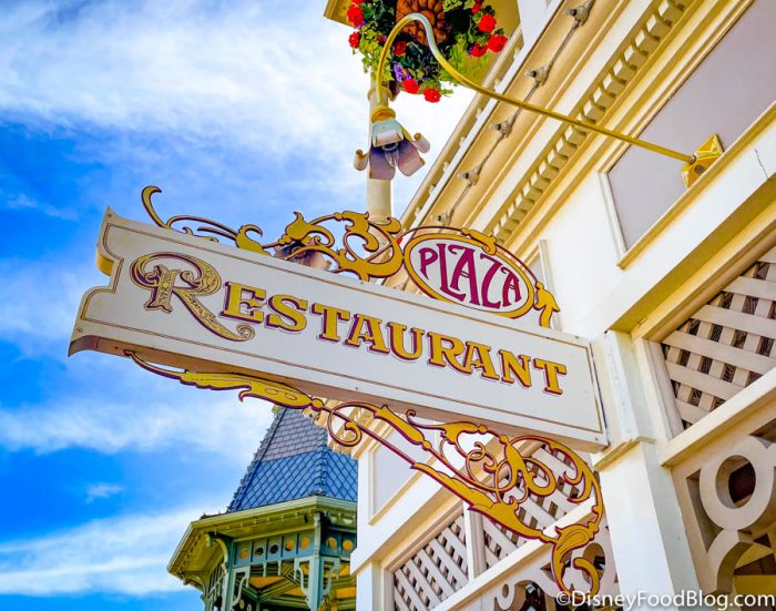 Head to the end of Main Street and look to your right. Here — under normal circumstances — is the ever-popular Plaza Ice Cream Parlor. This spot has remained closed ever since the parks reopened BUT, what hasn’t been closed is the other half of the Plaza experience you can find just around the corner — the Plaza Restaurant.