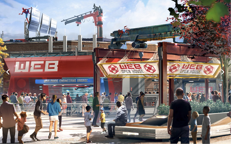 The land will consist of locations hosted by various Avengers! The first is the Worldwide Engineering Brigade (also known as WEB), which is where you’ll be able to find WEB Slingers: A Spider-Man Adventure.