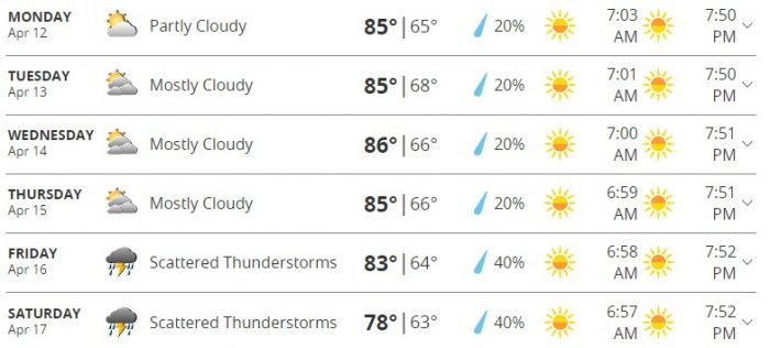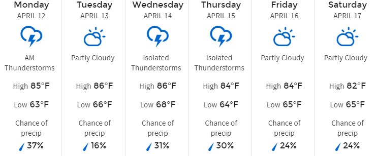 Saturday, April 17th brings us slightly cooler temps in the low-80s and. YEP, we’ve got some rain.