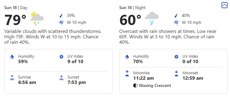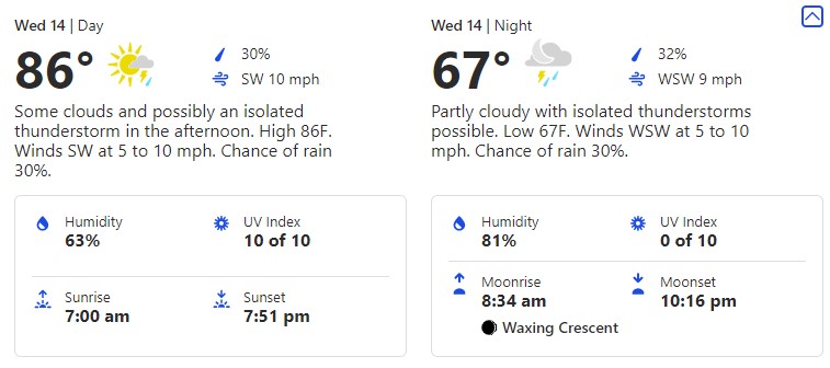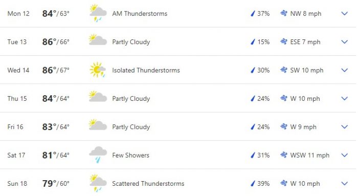 Here is a full overview of the week according to The Weather Channel. Temperatures are projected to be pretty stable for daytimes and evenings over the week. We’re looking at a range of 70s to 80s highs and 60s lows. Finally, no more 50-degree nights!