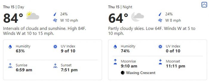 For Thursday, April 15th, we’re seeing a day with continued warm (but not too warm!) temps in the mid-80s and a comfy evening in the mid-60s.