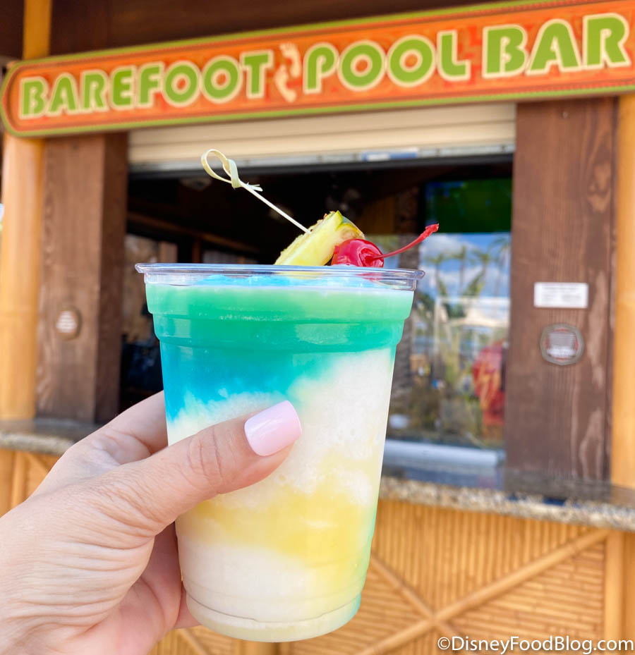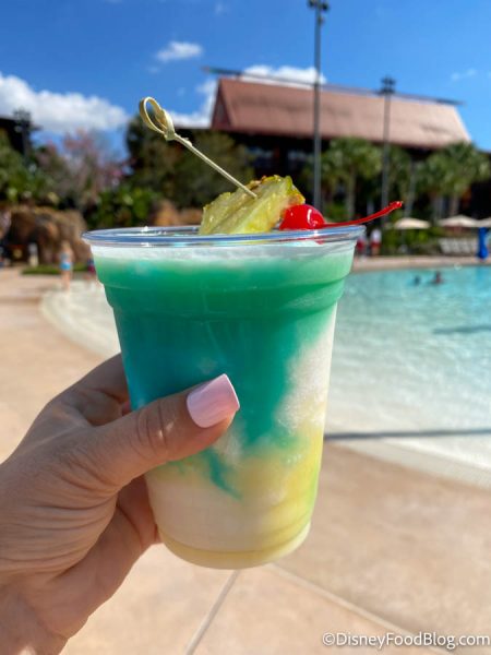 If you’re a superfan of the Kakamora Float at Magic Kingdom’s Aloha Isle, then this boozy twist from the Barefoot Pool Bar at Disney’s Polynesian Village Resort is the perfect option for you. This is a particularly special off-menu item for us here at DFB, because we helped create it ourselves! To order, just ask your friendly neighborhood Disney bartender for a mix of Parrot Bay coconut rum, pineapple juice, piña colada mix, and blue curaçao.