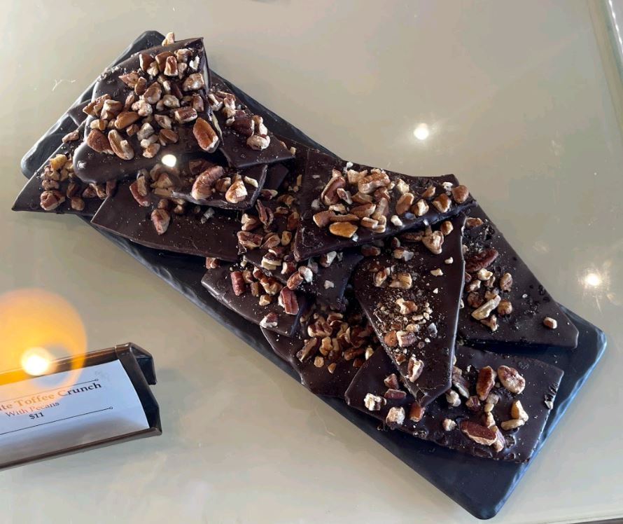 This is a chocolate bar topped with crispy toffee bits, pecans, and sea salt.