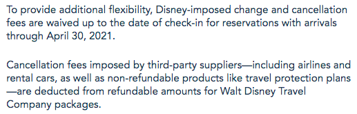 - “For cancellations made 30 days or more prior to guest arrival, amounts paid, minus cancellation fees assessed by third party hotels or other suppliers, non-refundable air transportation, non-refundable runDisney race registrations, non-refundable travel protection plan costs, and other amounts owed, will be refunded.”