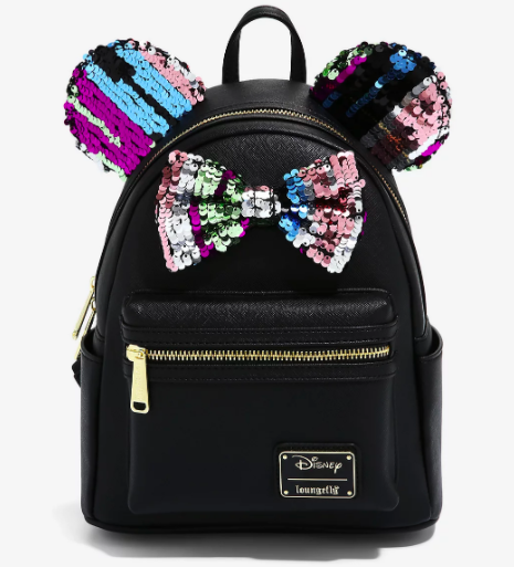 We’re kickin’ things off with some Minnie style! The Minnie Mouse Sequin Loungefly Backpack has LOTS of sequins in some unusual colors — her classic red look is gone. But inside, there’s a purple and black polka-dotted pattern so you can still rock the dots.