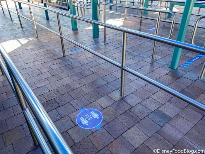 …and various signs on the floor, showing guests where they should stand and reminding them to keep an appropriate distance from others. This is similar to what we’ve seen in Disney World and elsewhere.