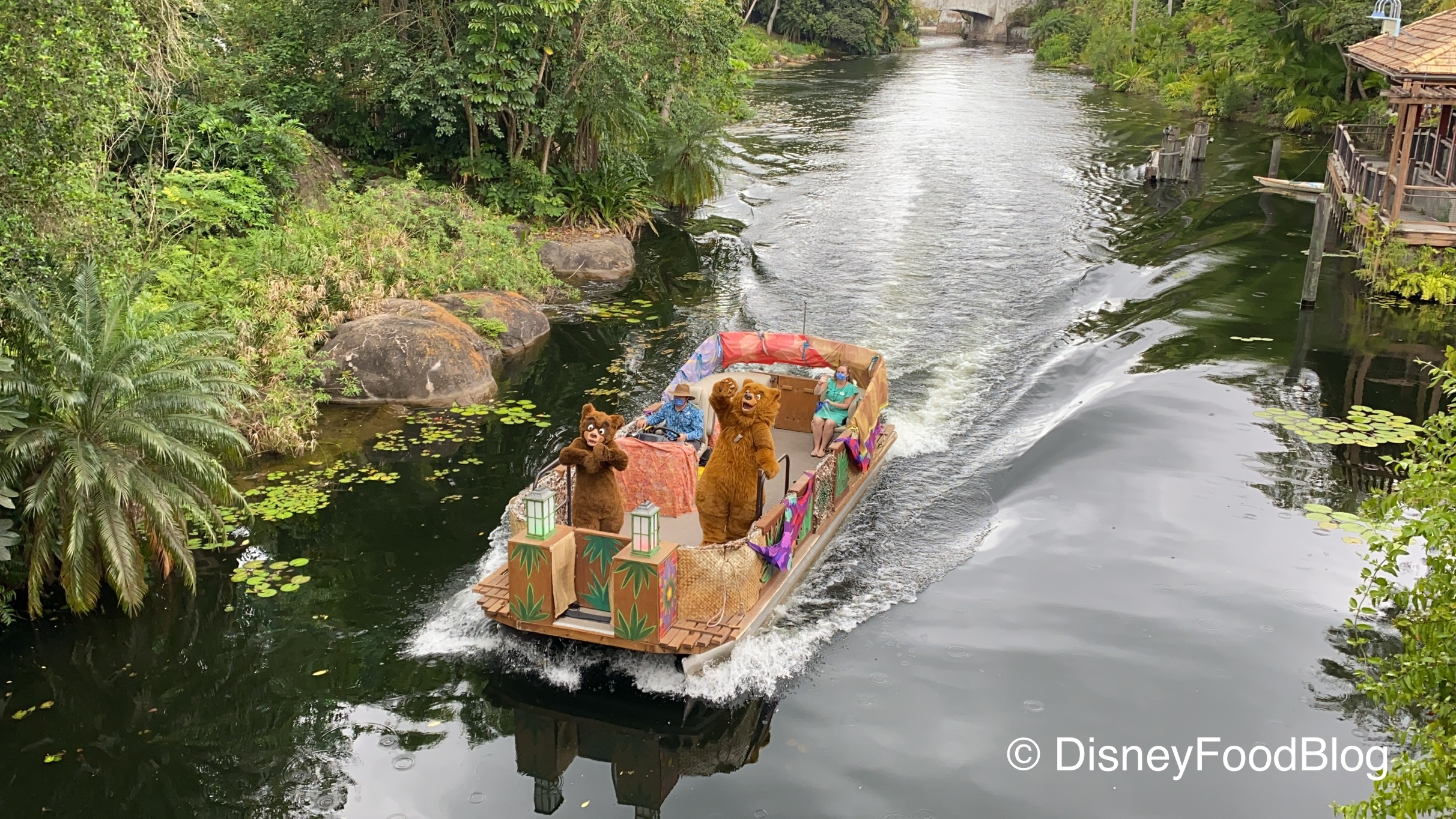 There’s a really unique way to see characters in Animal Kingdom. Since there are waterways that run throughout the park, characters pass by every so often on their very own flotillas! We’ve seen all sorts of friends while walking around Animal Kingdom in the past, like Pocahontas and Meeko, Pluto, and even Chip ‘n’ Dale in their dino gear! However, today, we saw something that really took the cake…