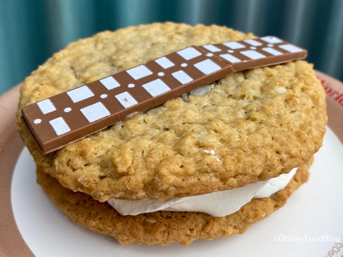 It’s time to head on over to Backlot Express to grab a Wookie Cookie! Just remember you have to say “Rrrrrrr-ghghghghgh!” before you bite into this oatmeal cookie sandwich filled with whoopie-pie cream filling and topped with a chocolate bar that looks like Chewbacca’s bandolier.