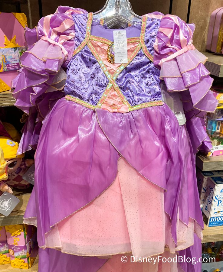 Rapunzel’s costume has puffed sleeves and sun-and-lattern detailing…