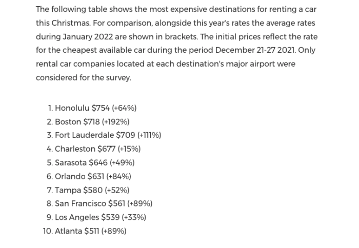 According to news shared on PR Newswire by CheapCarRental.net during December of 2021, car rental rates in Boston are nearly triple over Christmas. A week’s rental for the cheapest available car is about $718. But several Florida cities are not behind in terms of price. CheapCarRental.net looked at the most expensive destinations for renting a car this Christmas. “The initial prices reflect the rate for the cheapest available car during the period December 21-27 2021.”
