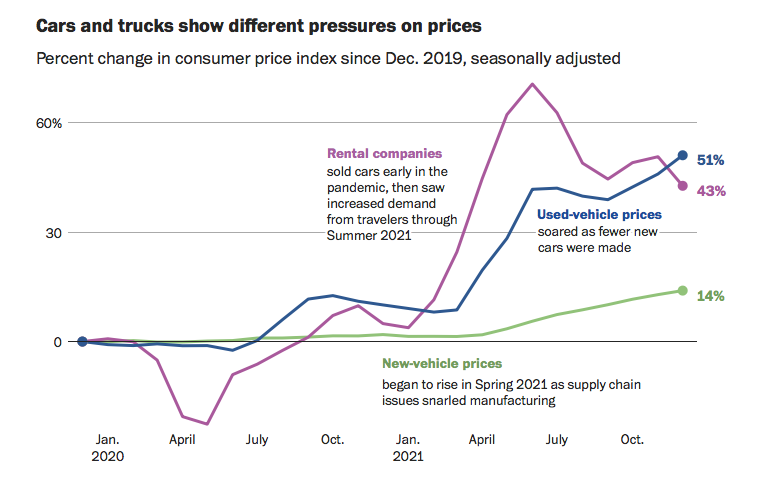 The Washington Post reports that inflation is at a 40-year high, impacting all kinds of different items. According to the Washington Post, “Used cars and trucks were a driving force behind the surge in inflation last year.” They note that the market relies heavily on trade-ins and auto parts, which have been low due to the microchip shortage. That has impacted the supply of used cars.