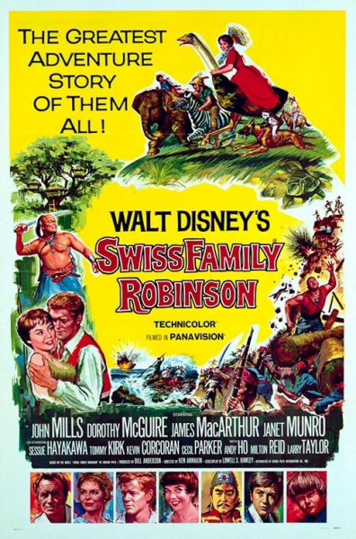 Most Disney fans are most familiar with Swiss Family Robinson Treehouse as a walkthrough attraction at several Disney Parks, but many might not know about the film that inspired it! The movie, Swiss Family Robinson, tells the story of a family shipwrecked on an island (and no, they don’t talk to a soccer ball).