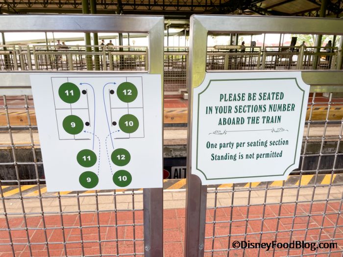 This explains to guests how to board the trains to maintain social distancing.