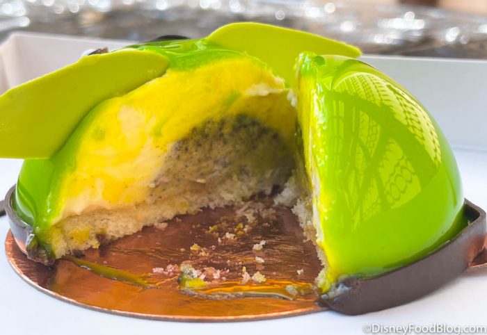 If you cut this little guy open, you’ll see that combo of 2 mousses and cookie crumbs layered inside the cake itself. And we’ve gotta say, it looks JUST like an avocado. Anyone else?! (No, seriously. We can’t unsee it now.).