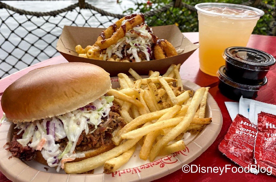 We ordered up (one of our favorites) the Baked Macaroni and Cheese with Pulled Pork for $11.99, AND the Smoked Pulled Pork Sandwich for $10.99. To wash it all down we grabbed a Mandarin Orange Vodka Lemonade for $11. Of course, we ordered some sides of barbecue sauce as well (self-serve pumps used to be located around the seating areas but those aren’t being offered since the parks reopened!).