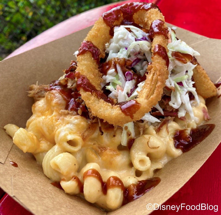 The Baked Macaroni and Cheese is piled high with pulled pork, cole slaw, a (very large) onion ring, and BBQ sauce.