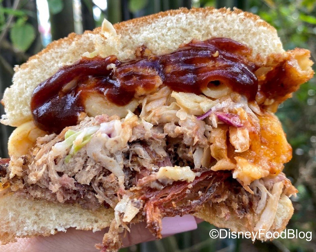 Flame Tree Barbecue remains a GREAT fast food option in Animal Kingdom! The portions are large and the outdoor dining area is beautiful and relaxing. You will NOT leave here hungry (especially if you order TWO entrees like we did!). We loved our Smoked Pulled Pork Mac and Cheese sandwich hack, but if you had to choose one or the other we’d recommend the mac and cheese. It had the best of everything and honestly, it’s what we gravitate towards every time we come here for good reason. If you’re looking for a solid choice for lunch on your Animal Kingdom day, you likely won’t be disappointed here. Keep checking DFB for more park snack hacks!