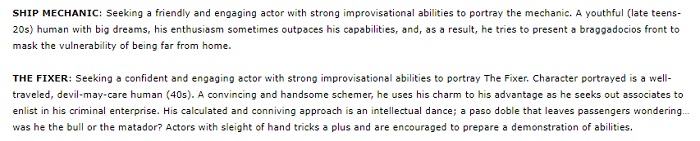 First up, we have The Captain, who will be a worldly Pantoran in her 40s or 50s. “She is a strong and charismatic leader who has served as a well-respected ship commander for some time and demands the attention and focus of every room she walks into,” the job description states.