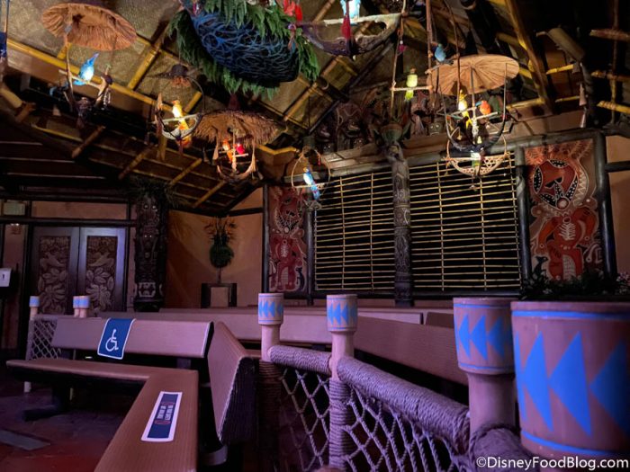 One of the windows in The Enchanted Tiki Room was covered with a black sheet during one of our visits.
