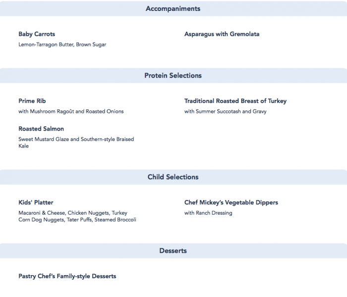 The revamped dinner menu will feature four courses: a starter, plated signature items, a protein selection (Prime Rib, Roasted Salmon, and Traditional Roasted Breast of Turkey), and dessert. There is also a kids’ menu which features a Kids’ Platter with Macaroni & Cheese, Chicken Nuggets, Turkey Corn Dog Nuggets, Tater Puffs, and Steamed Broccoli.