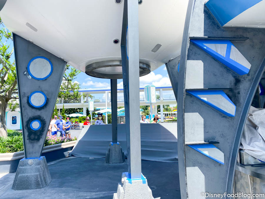 And, there’s another update to a project in Tomorrowland that we’ve been tracking recently. Disney has been working on the refreshment kiosk, Cool Ship, for a little over a month now and it looks like they’re not done just yet. We noticed that blue tape had been added to some of the pillars holding up the building.