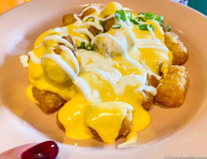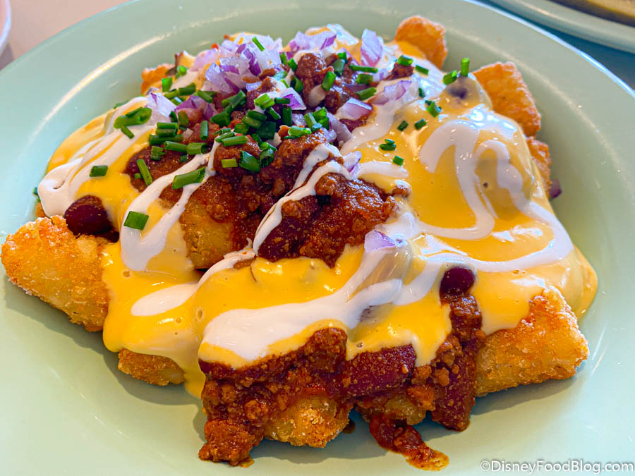 Let’s skip on over to Disney’s Beach Club Resort for our next few tot options. Beaches & Cream Soda Shop is home to quite a few potato choices, each for $9! First up is the Chili Cheese Tots which (like the name suggests) are topped with chili, cheese, sour cream, green onions, and chives. they also serve up cheese and bacon-covered tots and a few other varieties (spoiler alert: we’re showing them to you next!). Tots as far as the eye can see, here!