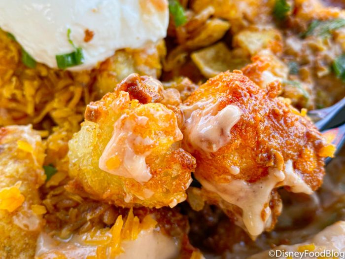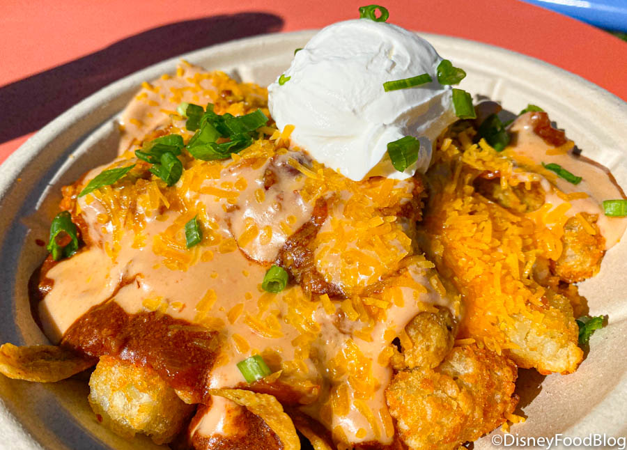 And last but not least, if you happen to stop by Blizzard Beach water park, you’ll want to look out for the Loaded Mountain Tots. This version is topped with beef chili, cheese sauce, onions, tomatoes, bacon bits, and sour cream — the works!