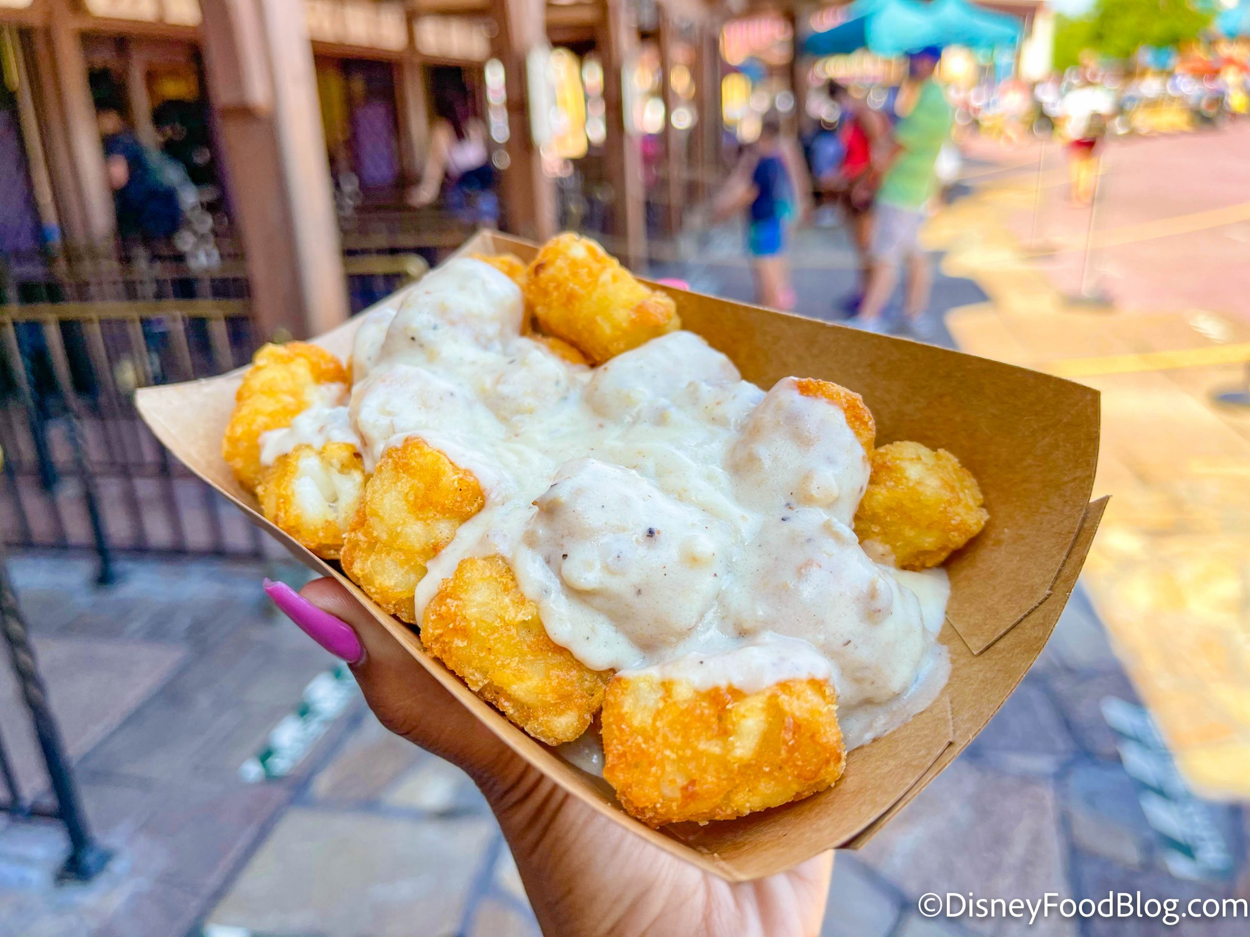 Tots lend themselves to every meal, don’t they? Even breakfast, these little crispy spuds can transform into a vehicle for other big, yummy breakfast flavors to get in our mouths! We’re glad that The Friar’s Nook in Magic Kingdom is giving us just that with their Sausage and Gravy Tots!