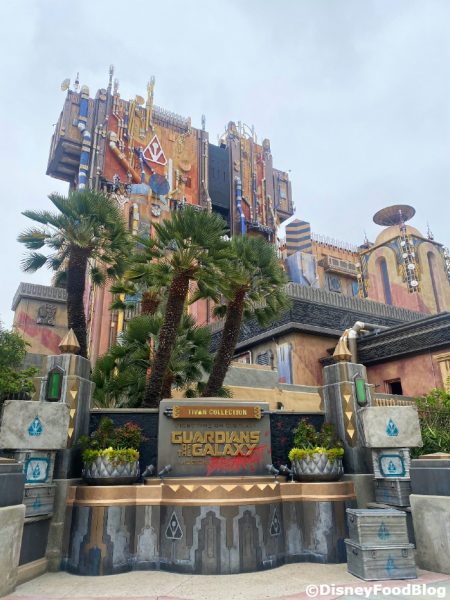 The ride itself looks the same from the outside, but we noticed TONS of blue ooze, which plays into the story of Avengers Campus! Apparently, the Collector’s Fortress caused a “cosmic disruption to ooze from the ground below.” Spooky!