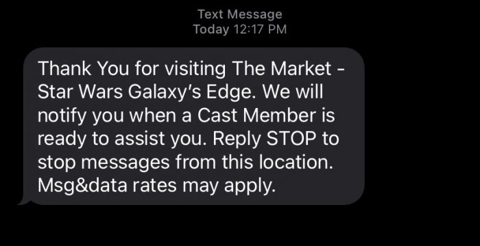 You’ll also get a text message telling you to wait until a Cast Member is ready to assist you.