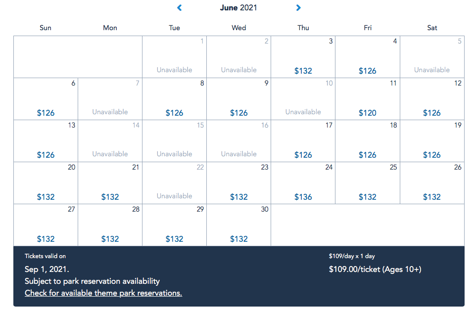 Again, park tickets vary in price depending on the dates you choose to visit.