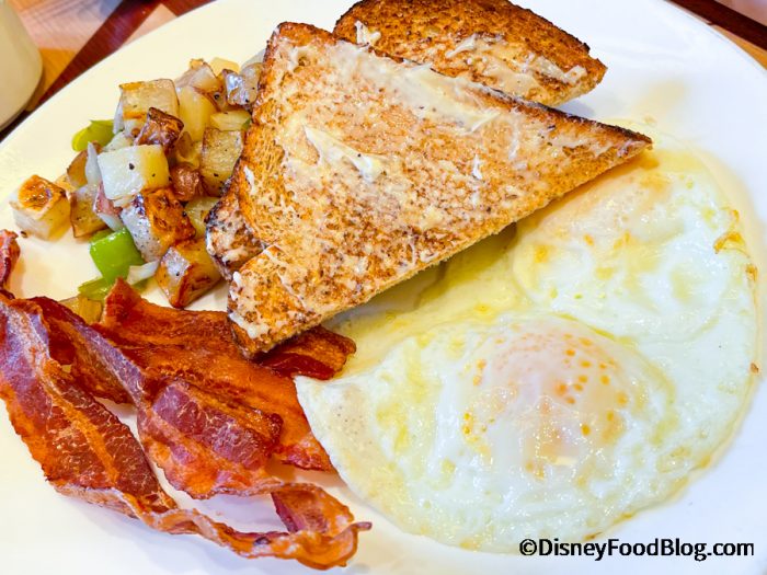 First, we’ll want to note that character dining is not currently available here. But this spot is open for a three-course breakfast and dinner, so we popped in to give it a try!